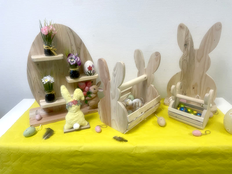 Janvier 2026Notre atelier menuiserie vous présente sa nouvelle gamme d'objets en bois à l'occasion des fêtes de Pâques : paniers à oeufs, présentoirs, objets décos...