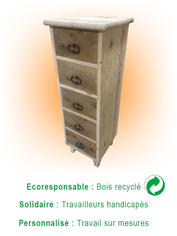 Rangement en bois naturel recyclé, fabriqué par des travailleurs handicapés.
