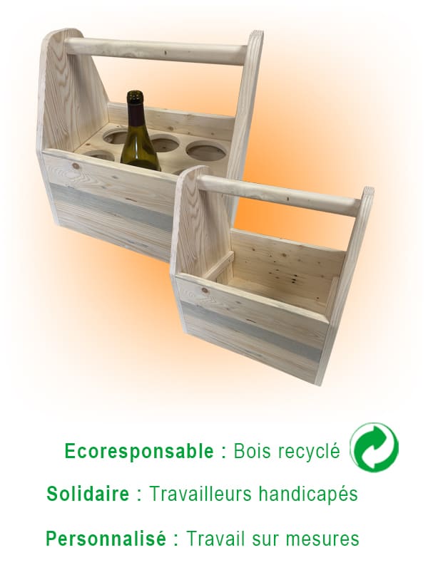 Porte-bouteille en bois naturel recyclé, fabriqué par des travailleurs handicapés.