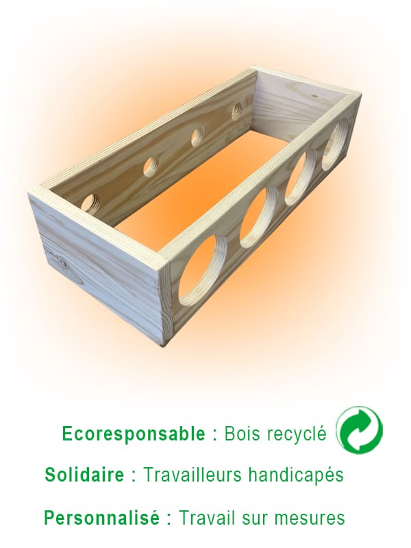 Repose-bouteille en bois naturel recyclé, fabriqué par des travailleurs handicapés.