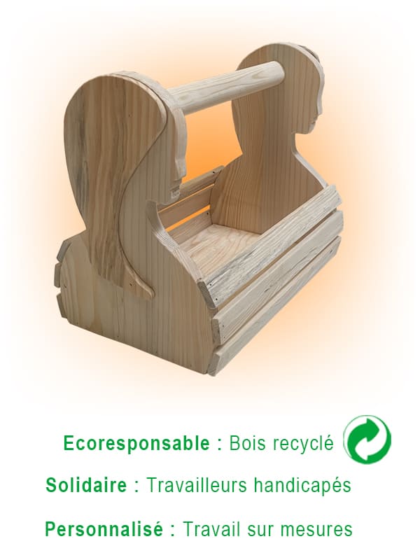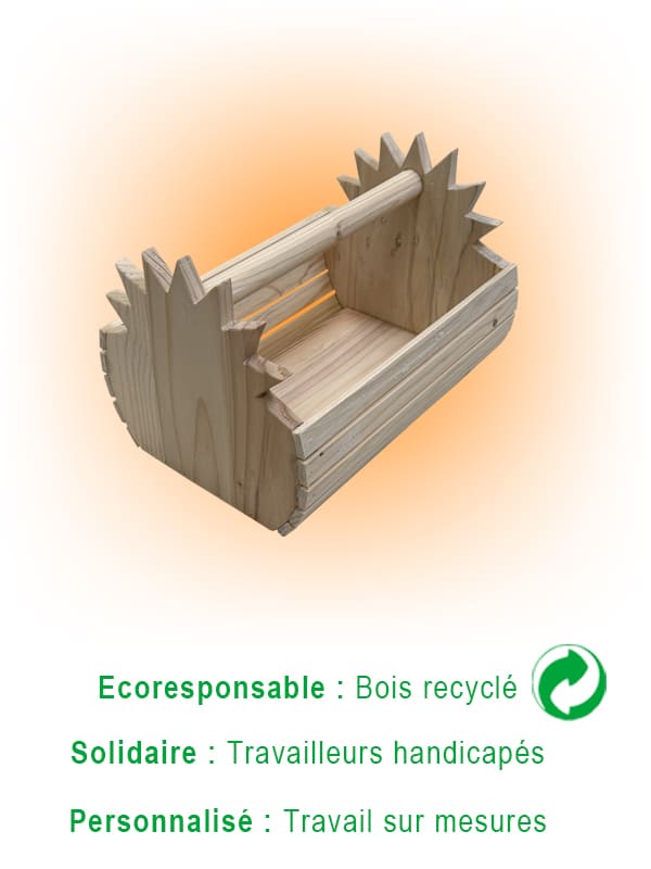 Grand panier à oeufs déco en bois naturel recyclé, fabriqué par des travailleurs handicapés.