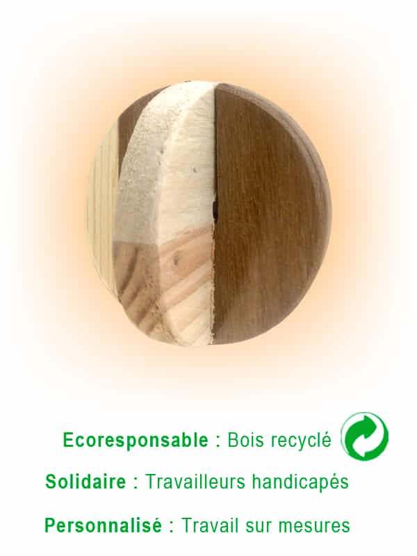 Boule à suspendre en bois naturel recyclé, fabriqué par des travailleurs handicapés.