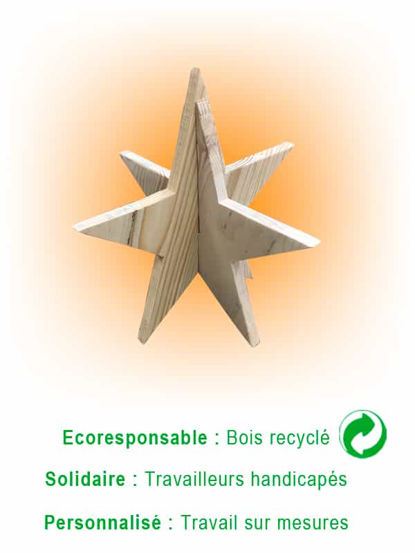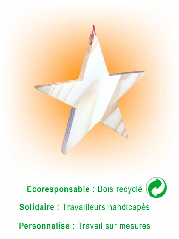 Etoile en bois naturel recyclé, fabriqué par des travailleurs handicapés.