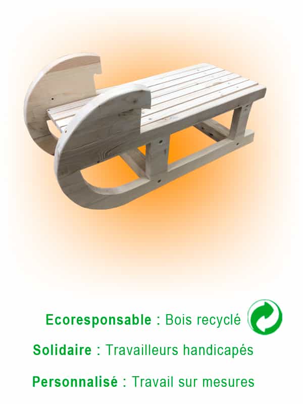 Luge en bois naturel recyclé, fabriqué par des travailleurs handicapés.