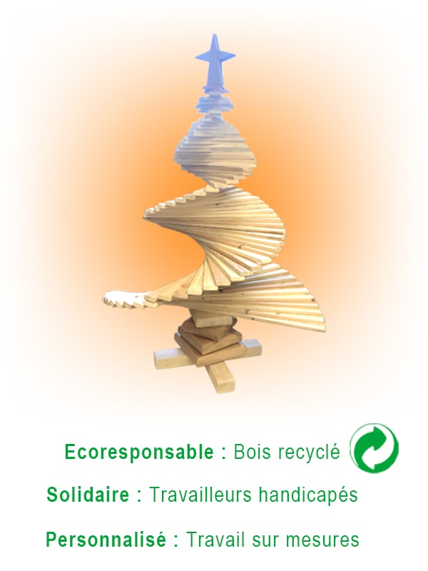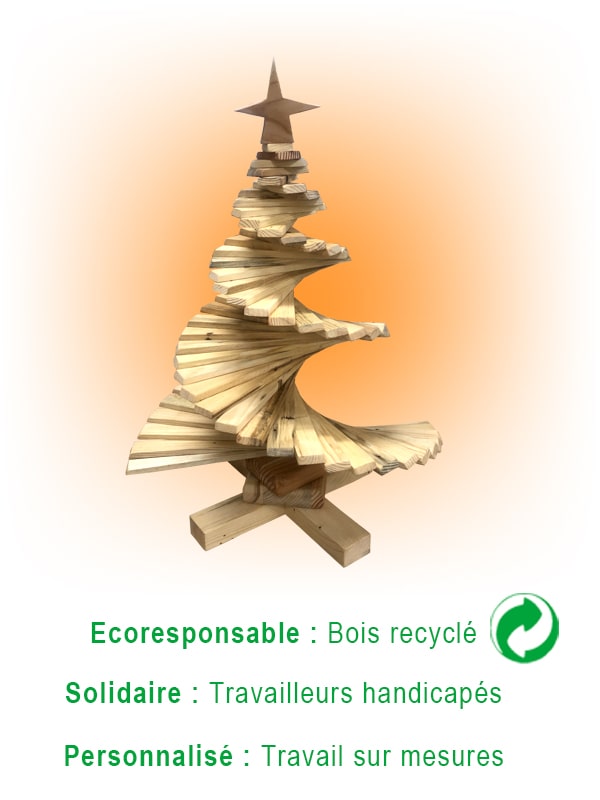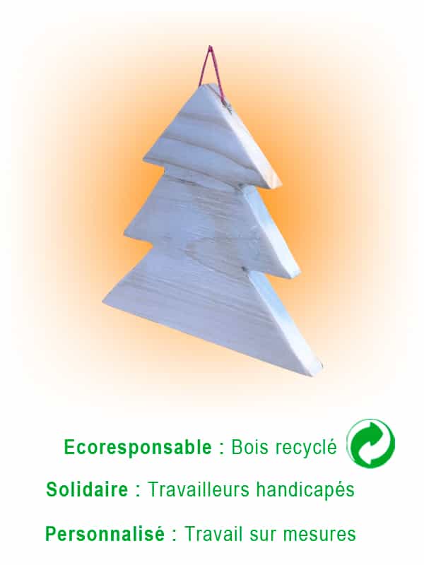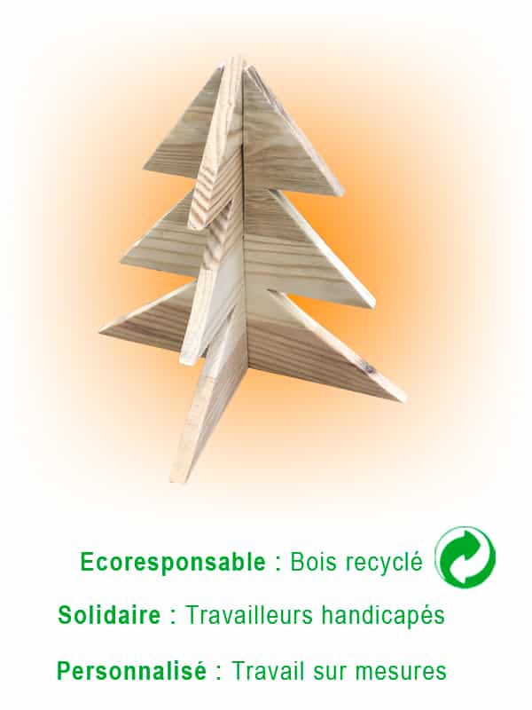 Sapin en bois naturel recyclé, fabriqué par des travailleurs handicapés.
