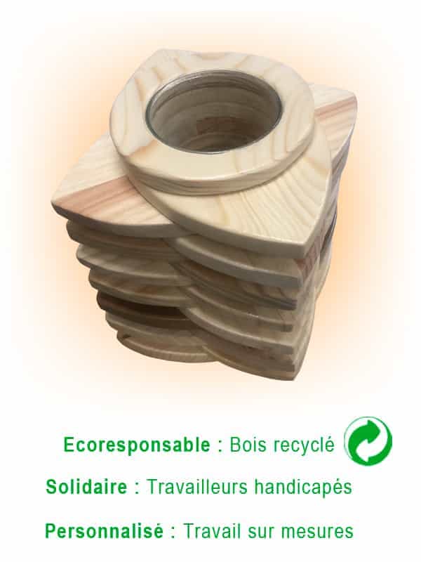 Vase déco en bois naturel recyclé et verre, fabriqué par des travailleurs handicapés.