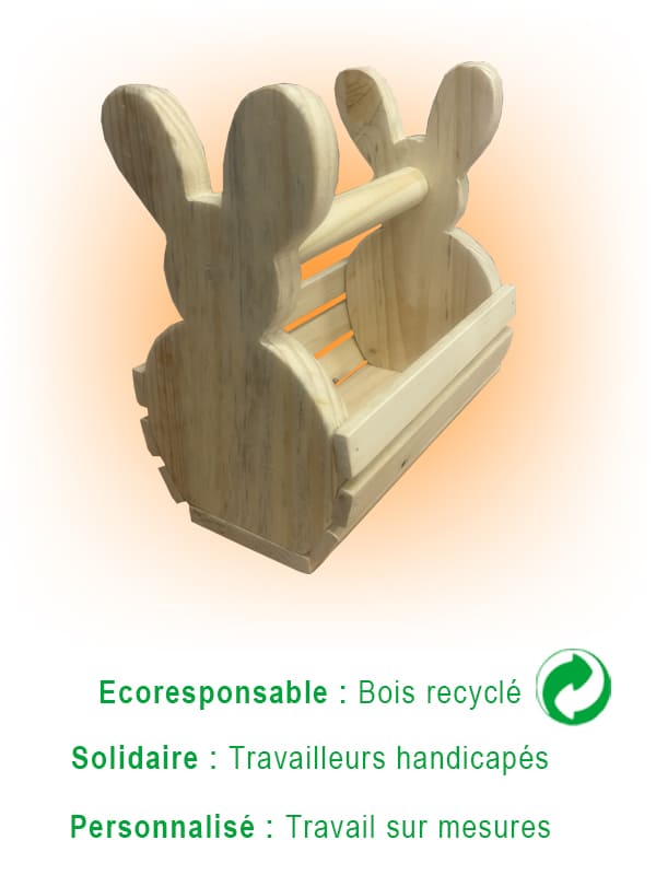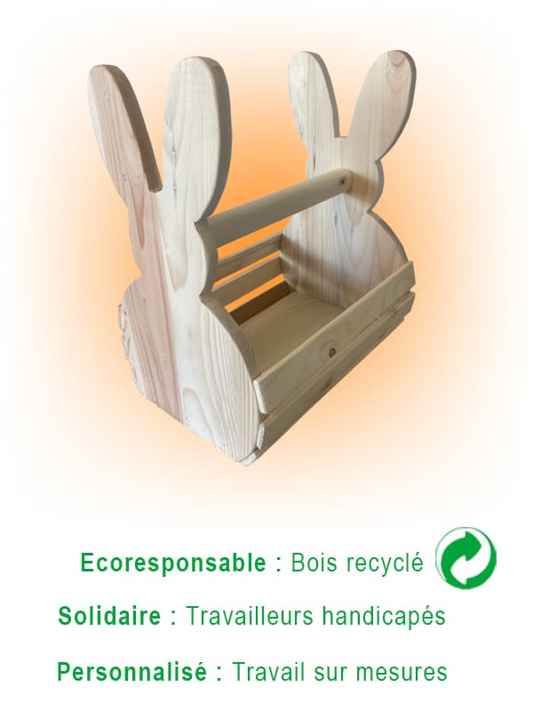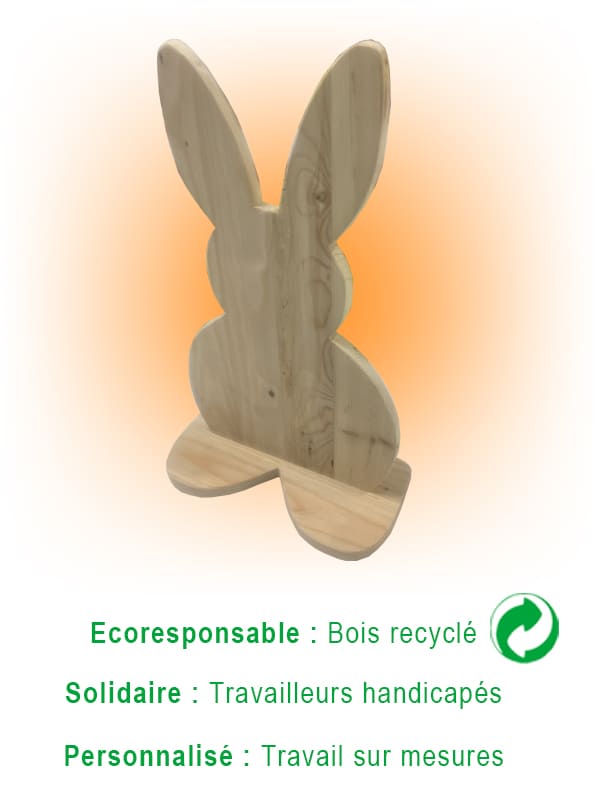 Lapin déco en bois naturel recyclé, fabriqué par des travailleurs handicapés.
