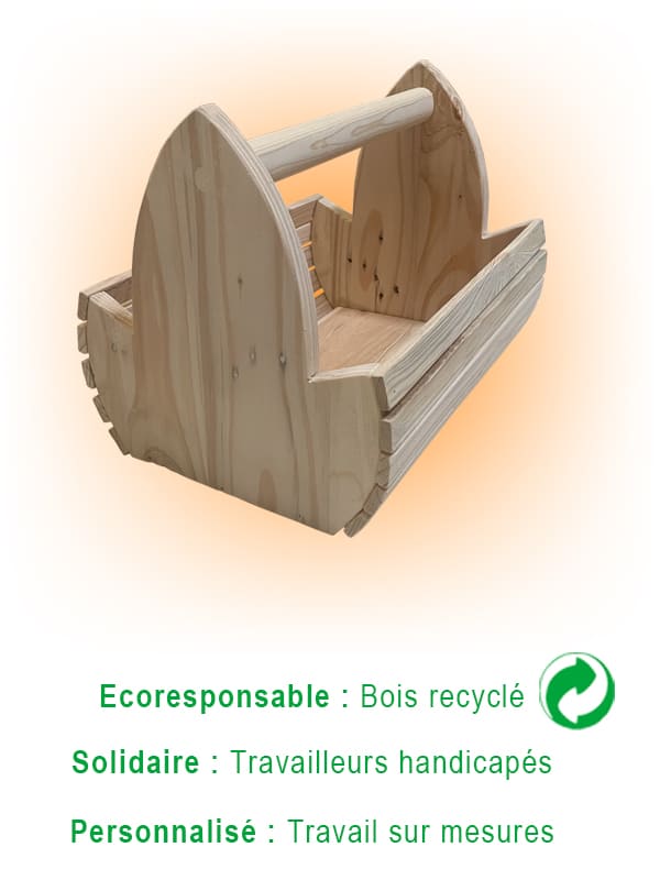 Grand panier à oeufs déco en bois naturel recyclé, fabriqué par des travailleurs handicapés.