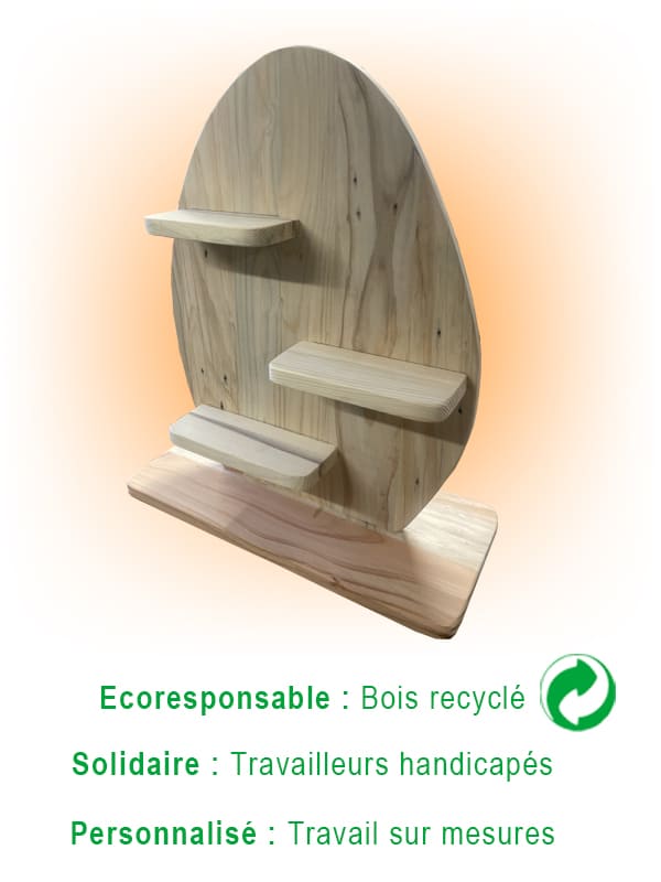 Présentoir déco en bois naturel recyclé et verre, fabriqué par des travailleurs handicapés.